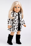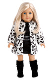 Glamour Girl - Clothes for 18 inch Doll - Snow Leopard Faux Fur Coat with Black Velvet Dress and Boots