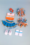 This complete 6 piece cheerleader outfit includes orange and white blouse, turquoise skirt finished with white and orange ribbon, matching pompons, headpiece, socks and shoes.