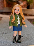 Camo Chic - 4 piece doll outfit - Green suede jacket, ivory tank top, denim mini skirt and high camouflage boots.