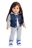 Tomboy 4 piece doll outfit includes a jeans jacket, grey sweatpants, t-shirt and blue boots.