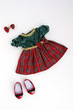 Holiday party dress with green velvety top embroidered with golden ribbon at the neck and waist, red plaided skirt with decorated bow at waist and for hair and red shoes with black bow.